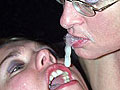 and lets the cum dribble into her open mouth .. the girlfriend then shares the cum with